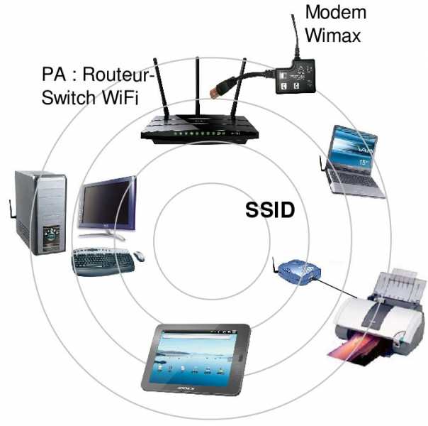 SSID (Service Set Identifier) est un identifiant de 32 caractères servant de nom pour le réseau. Il représente un premier niveau de sécurité dans la mesure où la connaissance du SSID est nécessaire pour qu'une station se connecte au réseau WiFi.